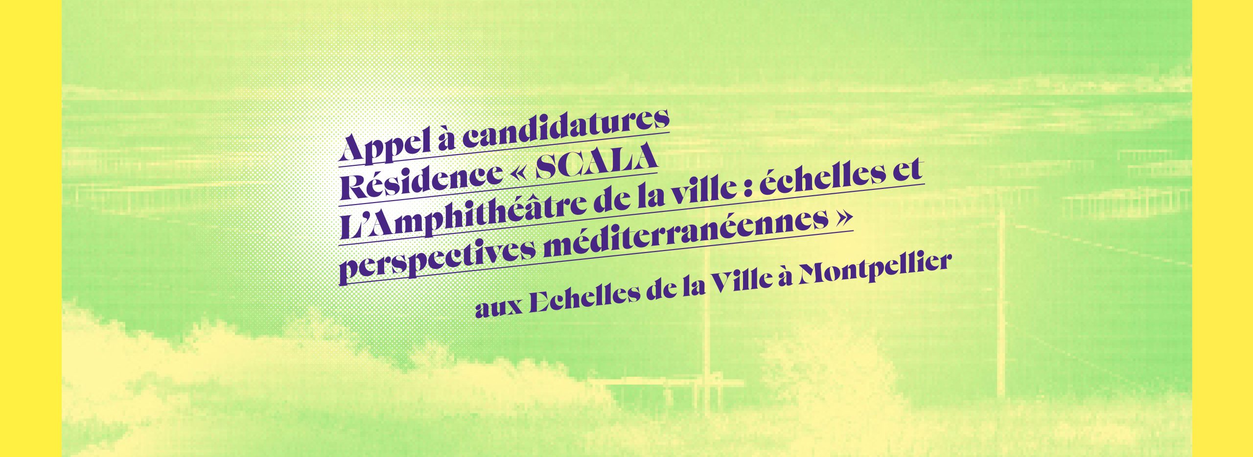 La résidence “SCALA” invite un duo, composé d’un.e architecte et/ou urbaniste et d’un.e artiste, à interroger le rôle fondamental de la nature dans la ville de Montpellier à travers ses différentes échelles à toutes les échelles du vivant. Du plus micro au plus macro, la relation des projets de renaturation urbaine et la réactivation d’espaces publics majeurs (esplanade Charles de Gaulle, toit du Corum, place de la Préfecture, place Max Rouquette, renouvellement de l’EAI, …) avec le grand paysage méditerranéen (bord du Lez, rétro-littoral, route de la Mer, rambla Georges Frêche, …) servira de base de réflexion.