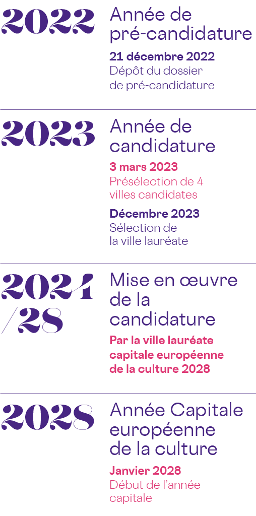 Chaque année, le titre est décerné à une ville, dans deux pays de l’Union Européenne selon une liste chronologique préétablie jusqu’en 2033.