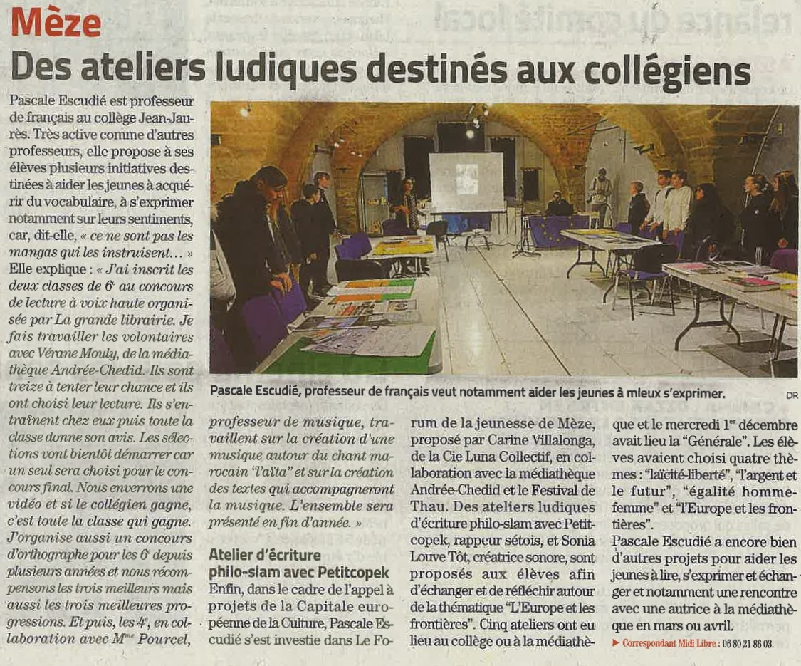 – Des ateliers ludiques d’écriture philo- slam avec une classe de Collège à la Médiathèque de Mèze proposeront aux collégiennes et collégiens d’échanger et réfléchir autour de la thématique