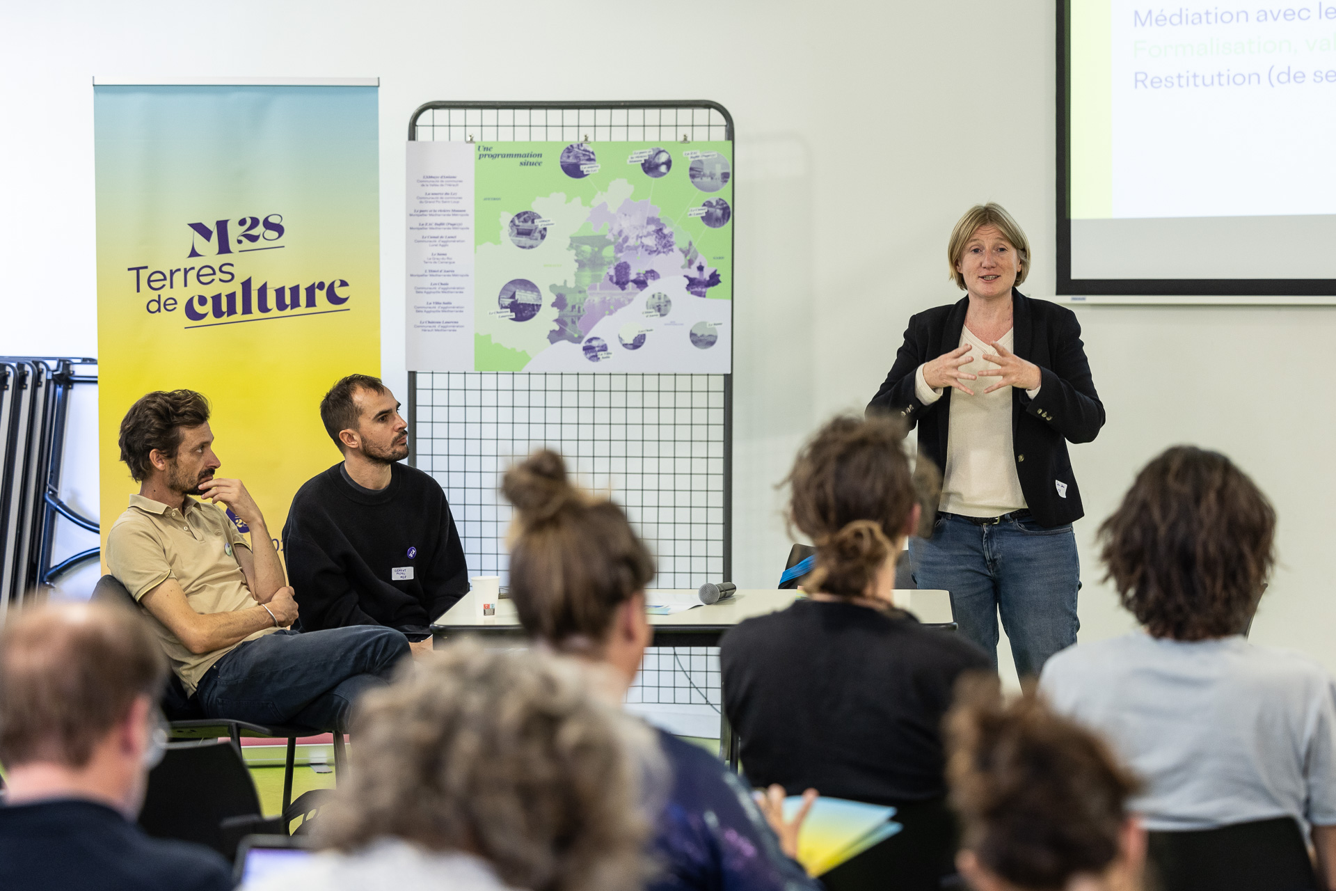 Afin d’illustrer la démarche M28, des exemples de projets situés ont été partagés par des acteurs culturels du territoire. À titre d’exemple, Elise Armentier, co-directrice de l’association Bouillon Cube, a parlé du projet “La Route de l’eau” imaginé sur le territoire du Grand Pic Saint-Loup. Loïc Gourié, directeur culture de la ville de Lunel, a quant à lui abordé les initiatives sur Lunel Agglo, notamment sur les berges du Canal, suivi d’Adrien Cordier, directeur artistique d’Unaenime Collective avec “In the Food for Love” sur Sète Agglopôle Méditerranée.